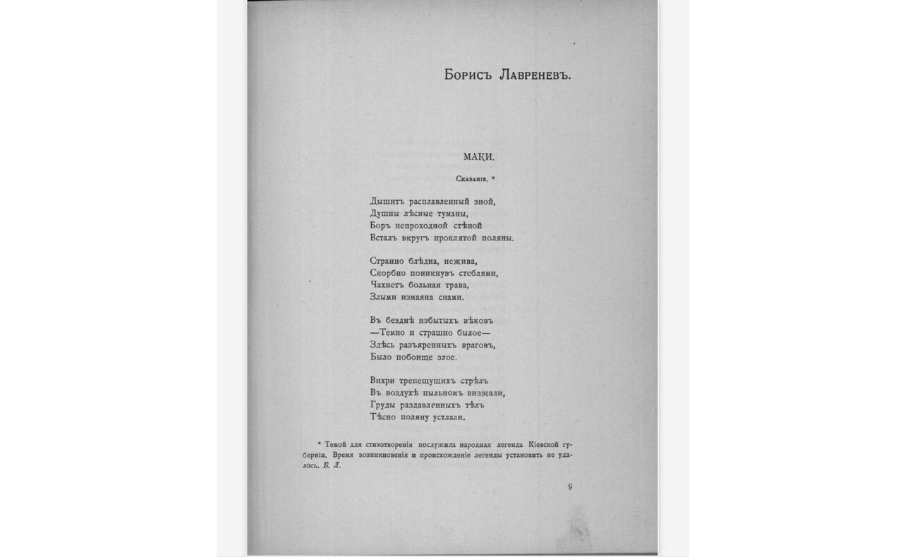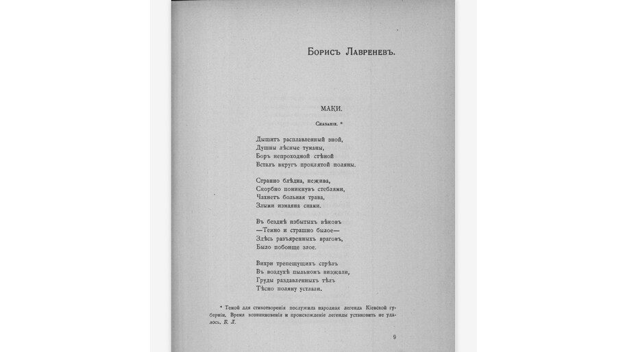 Вырвавшись из-под надзора строгого отца, который когда-то раскритиковал стихи за «хромой, колченогий, параличный» размер, молодой человек решил наверстывать упущенное. Весной 1911 года в популярной херсонской газете «Родной край» опубликовали его стихотворение. Через год небольшой цикл стихов вышел в московском альманахе «Жатва». Это было признанием: поэзия Бориса Лавренёва соседствовала с работами мэтров — Валерия Брюсова и Константина Бальмонта.