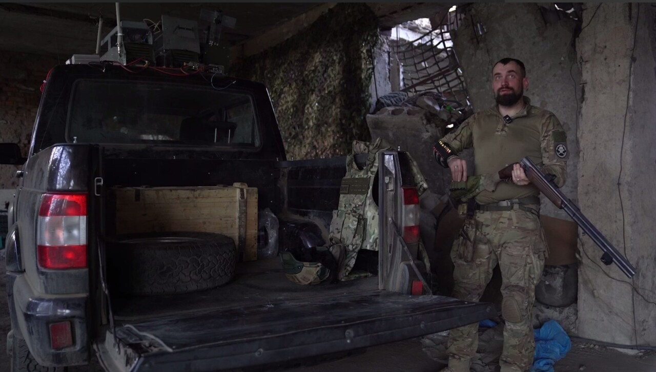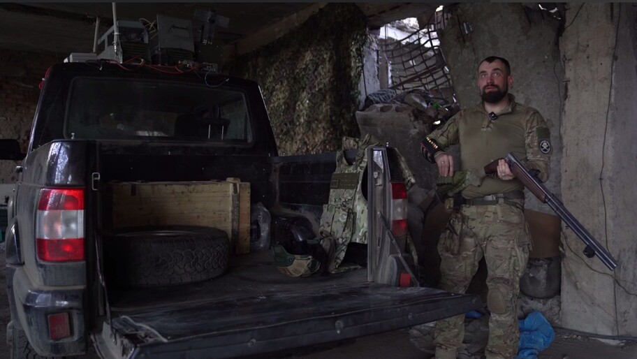Доброволец рассказал, что занимается обеспечением бойцов на передовых позициях — подвозит воду, боекомплект и топливо. По его словам, главную опасность тут представляют вражеские беспилотники, так как машина для оператора БПЛА относительно простая цель. Для защиты от FPV-дронов у Варяга, помимо прочего, в снаряжении гладкоствольное ружье.
